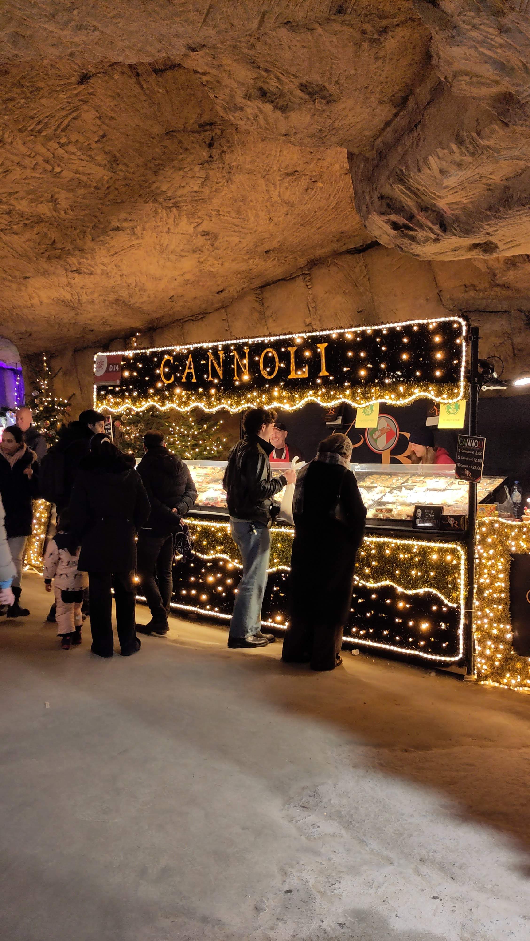 洞穴的確不小,很多攤位,賣各式各樣的東西。有吃的、衣服、紀念品、玩具、手作、工藝品等。我們在裡面剛好有遇到一攤販賣西西里島名產 Cannoli。 有好多種口味,包括開心果、巧克力、檸檬等,很巧的是,剛好前幾天在電視上有看到一個節目在介紹西西里的 Cannoli ,於是就買了幾盒來嚐嚐。味道還不錯,我和萱萱 都喜歡。